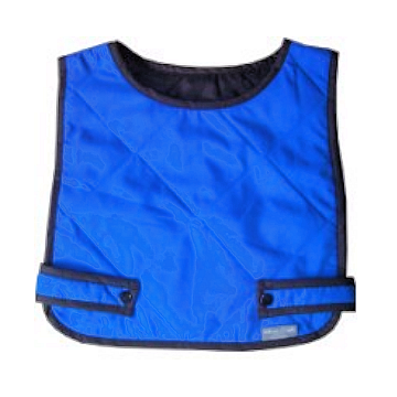 Simple and comfortable children's cooling vest with snap opening at the shoulder and two adjustable buttoned waist straps.
